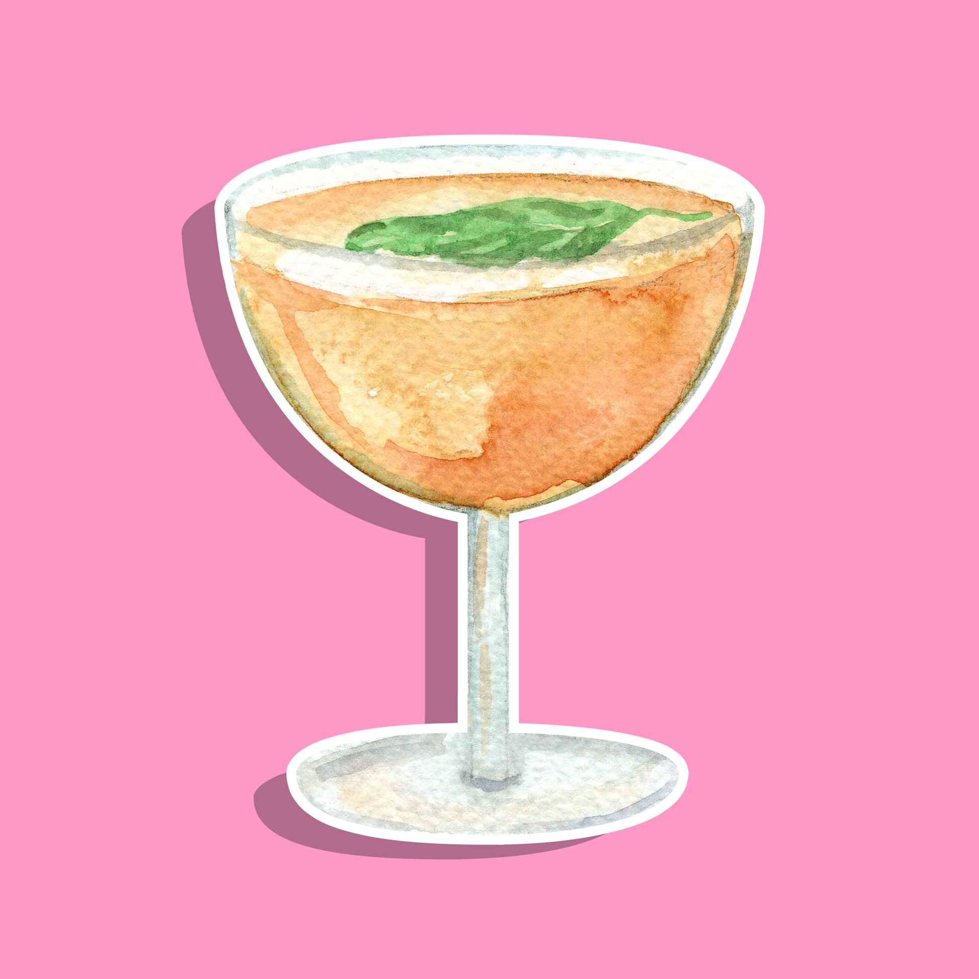 Une coupe basse et élégante, ambre doré qui chauffe vers le orange-rosé, et une feuille de basilic vert posée délicatement sur la surface comme un souffle d'été.